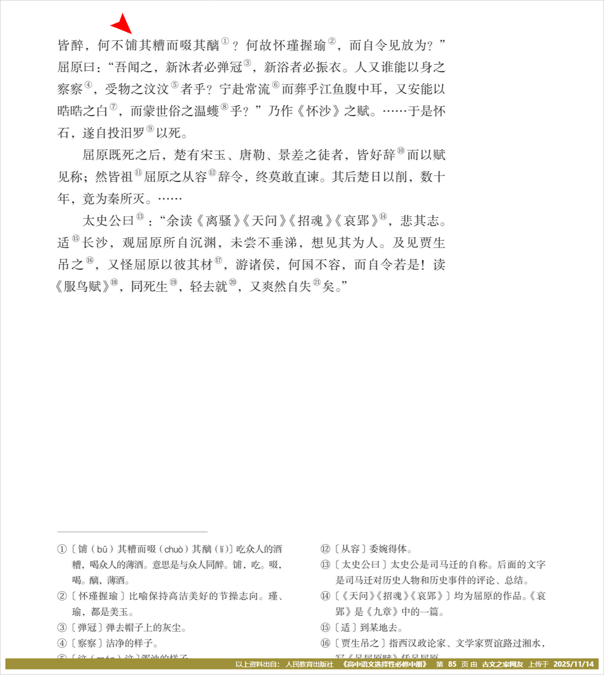 - 适长沙,观屈原所自沉渊,未尝不垂涕,想见其为人。