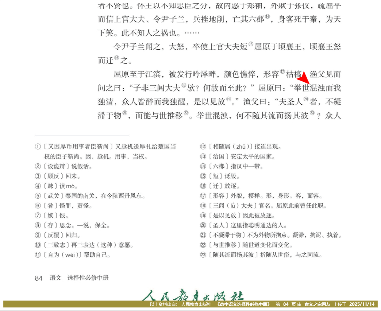 - 屈原至于江滨,被发行吟泽畔,颜色憔悴,形容枯槁。