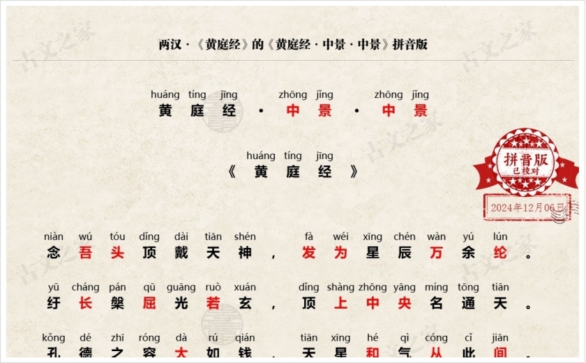 《黄庭经·中景·中景》拼音版,可打印PDF文档下载