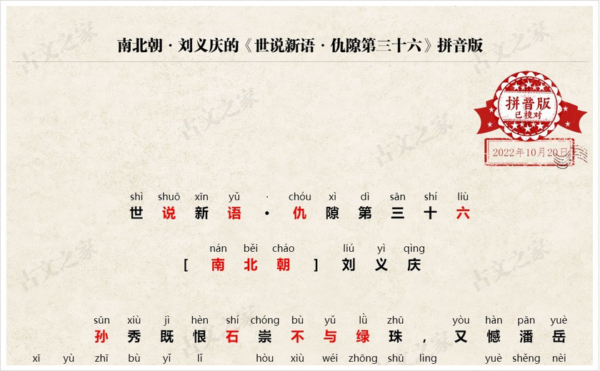 拼音全文:(我们坚持对每一篇古诗文进行人工查证并注音、我们亲自查证并回复来自您的每一次纠错,只为给您一份更为准确的拼音版本,请记住我们:古文之家)