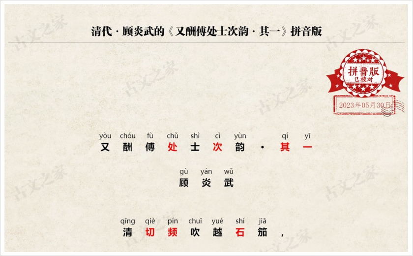拼音全文:(我们坚持对每一篇古诗文进行人工查证并注音、我们亲自查证并回复来自您的每一次纠错,只为给您一份更为准确的拼音版本,请记住我们:古文之家)