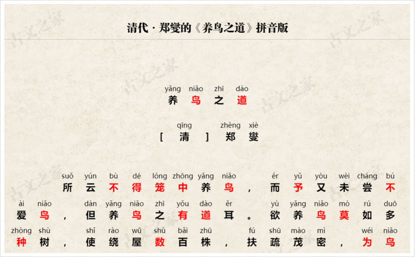 《养鸟之道》拼音版,可打印PDF文档下载郑燮-文言文