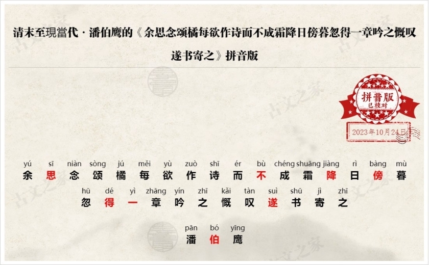 拼音全文:(我们坚持对每一篇古诗文进行人工查证并注音、我们亲自查证并回复来自您的每一次纠错,只为给您一份更为准确的拼音版本,请记住我们:古文之家)