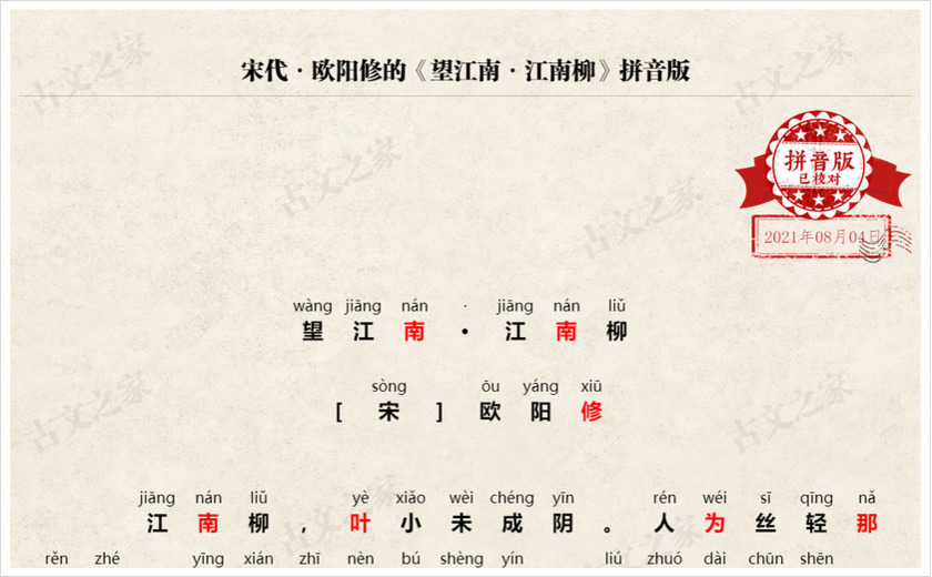 拼音全文:(我们坚持对每一篇古诗文进行人工查证并注音、我们亲自查证并回复来自您的每一次纠错,只为给您一份更为准确的拼音版本,请记住我们:古文之家)