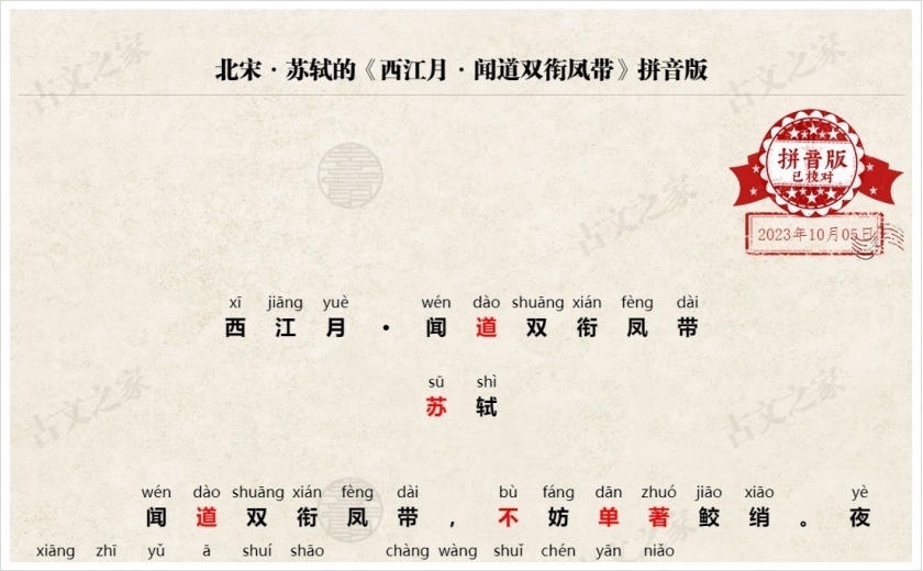 《西江月·闻道双衔凤带》拼音版,可打印PDF文档下载苏轼