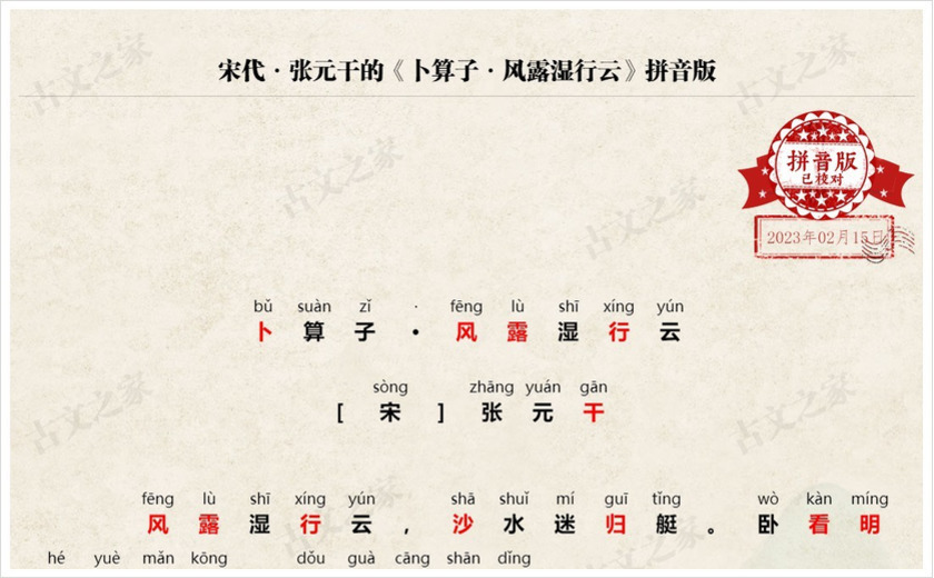 拼音全文:(我们坚持对每一篇古诗文进行人工查证并注音、我们亲自查证并回复来自您的每一次纠错,只为给您一份更为准确的拼音版本,请记住我们:古文之家)