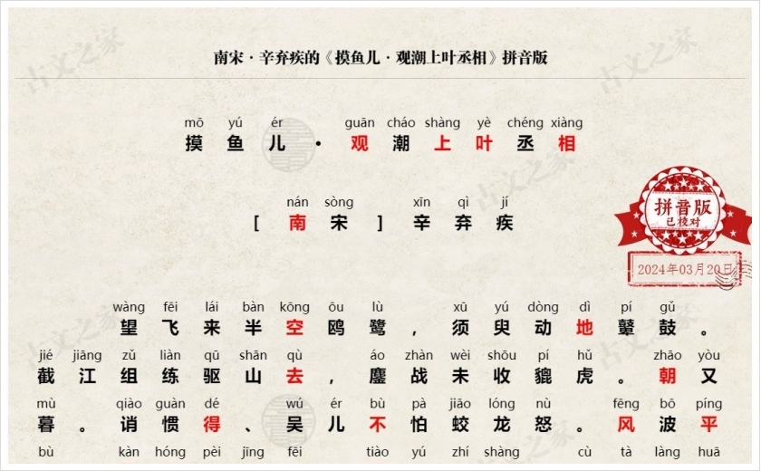 《摸鱼儿·观潮上叶丞相》拼音版,可打印PDF文档下载辛弃疾