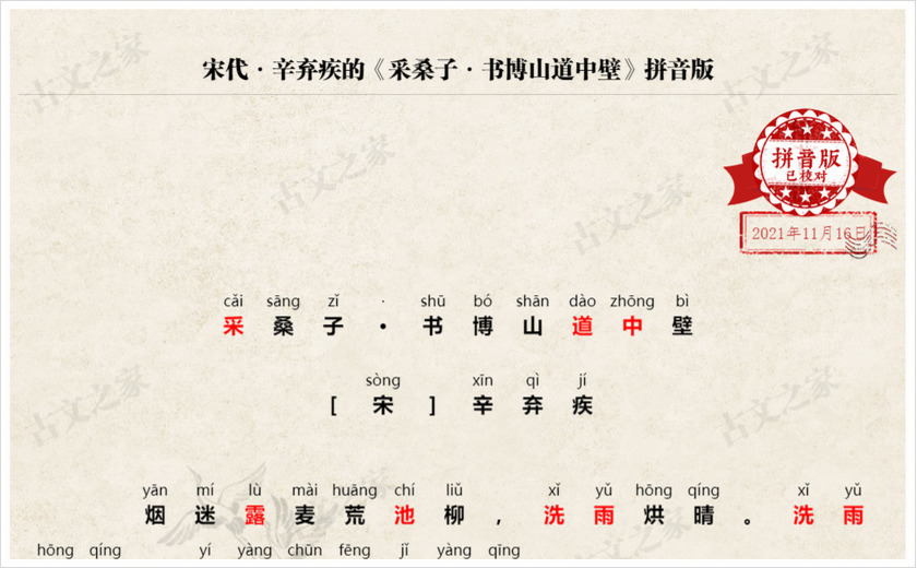 拼音全文:(我们坚持对每一篇古诗文进行人工查证并注音、我们亲自查证并回复来自您的每一次纠错,只为给您一份更为准确的拼音版本,请记住我们:古文之家)