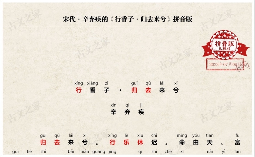 《行香子·归去来兮》拼音版,可打印PDF文档下载辛弃疾