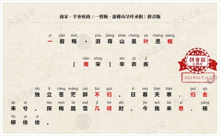 《一剪梅·游蒋山呈叶丞相》拼音版,可打印PDF文档下载辛弃疾