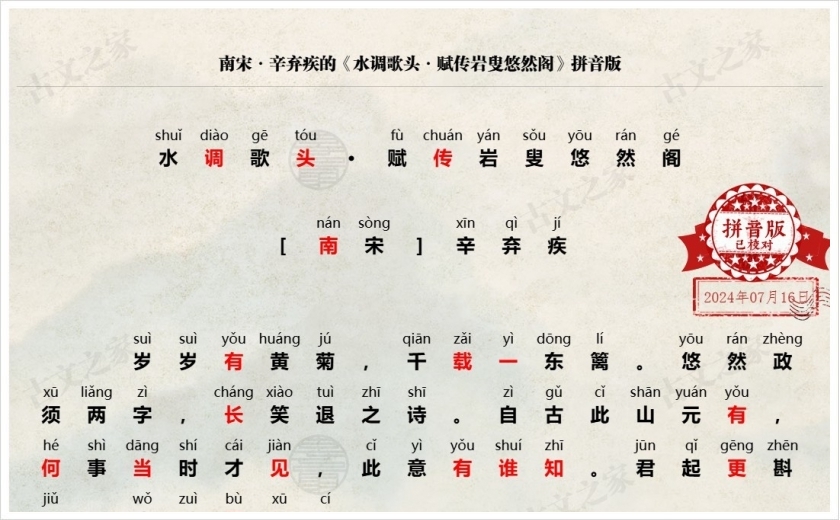 《水调歌头·赋传岩叟悠然阁》拼音版,可打印PDF文档下载辛弃疾