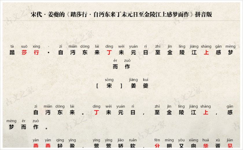 《踏莎行·自沔东来丁未元日至金陵江上感梦而作》拼音版,可打印PDF文档下载姜夔