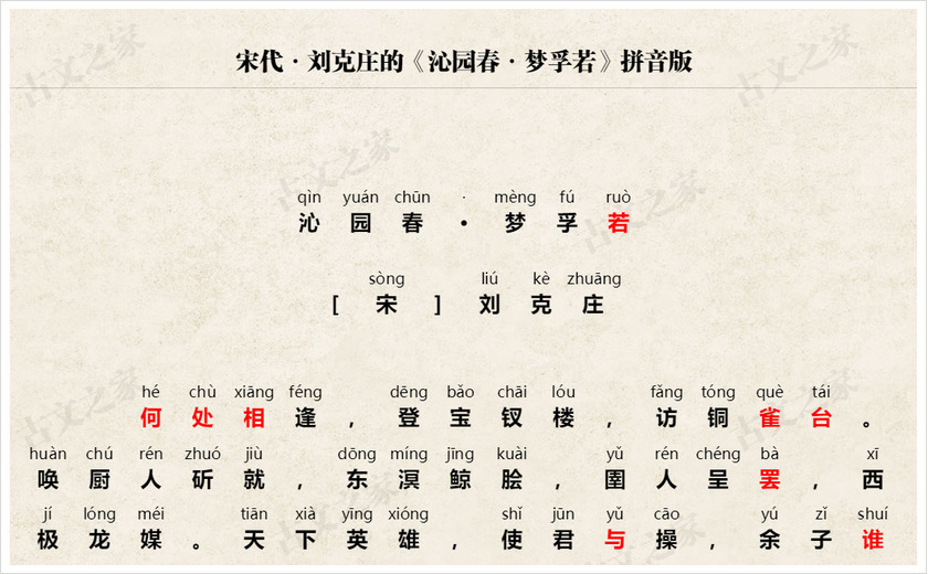 拼音全文:(我们坚持对每一篇古诗文进行人工查证并注音、我们亲自查证并回复来自您的每一次纠错,只为给您一份更为准确的拼音版本,请记住我们:古文之家)