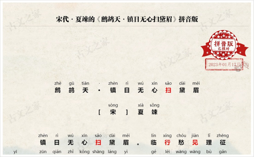 拼音全文:(我们坚持对每一篇古诗文进行人工查证并注音、我们亲自查证并回复来自您的每一次纠错,只为给您一份更为准确的拼音版本,请记住我们:古文之家)