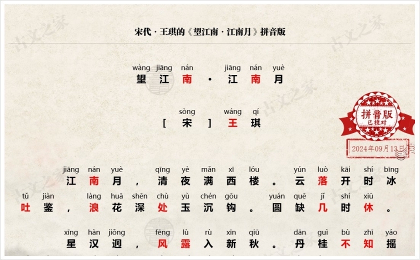 《望江南·江南月》拼音版,可打印PDF文档下载王琪