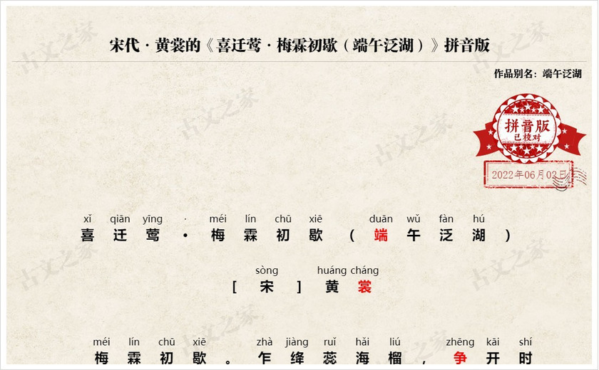 《喜迁莺·梅霖初歇(端午泛湖)》拼音版,可打印PDF文档下载黄裳