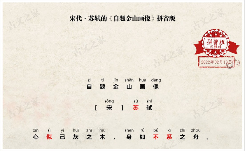 拼音全文:(我们坚持对每一篇古诗文进行人工查证并注音、我们亲自查证并回复来自您的每一次纠错,只为给您一份更为准确的拼音版本,请记住我们:古文之家)