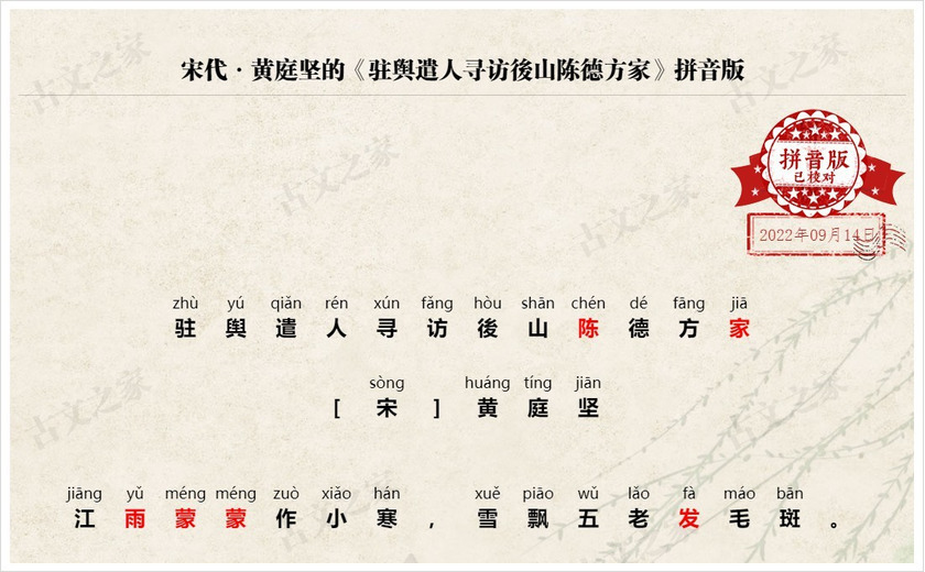 拼音全文:(我们坚持对每一篇古诗文进行人工查证并注音、我们亲自查证并回复来自您的每一次纠错,只为给您一份更为准确的拼音版本,请记住我们:古文之家)