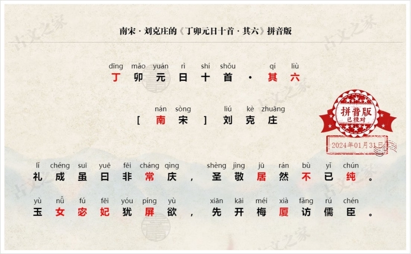 《丁卯元日十首·其六》拼音版、节奏划分及断句,可打印PDF文档下载刘克庄