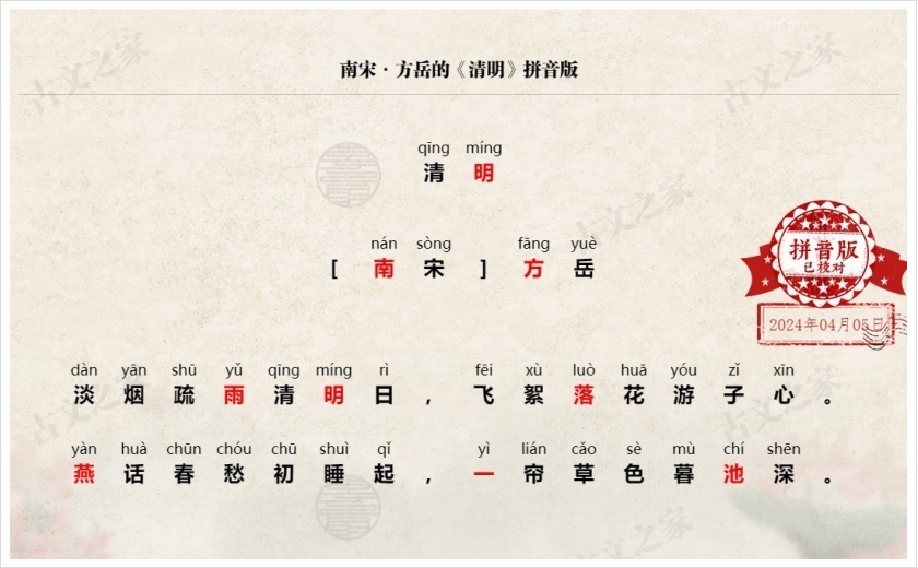 《清明》拼音版、节奏划分及断句,可打印PDF文档下载方岳