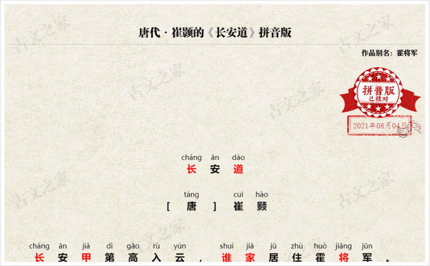 拼音全文:(我们坚持对每一篇古诗文进行人工查证并注音、我们亲自查证并回复来自您的每一次纠错,只为给您一份更为准确的拼音版本,请记住我们:古文之家)