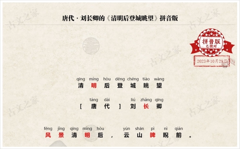 《清明后登城眺望》拼音版、节奏划分及断句,可打印PDF文档下载刘长卿