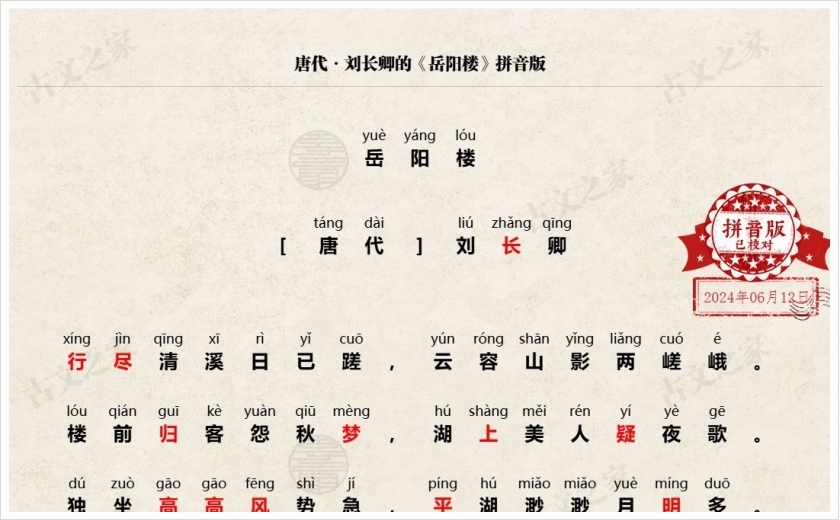 《岳阳楼》拼音版,可打印PDF文档下载刘长卿