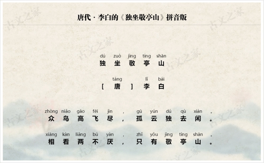 《独坐敬亭山》拼音版、节奏划分及断句,可打印PDF文档下载李白