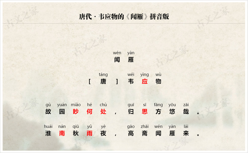 《闻雁》拼音版、节奏划分及断句,可打印PDF文档下载韦应物