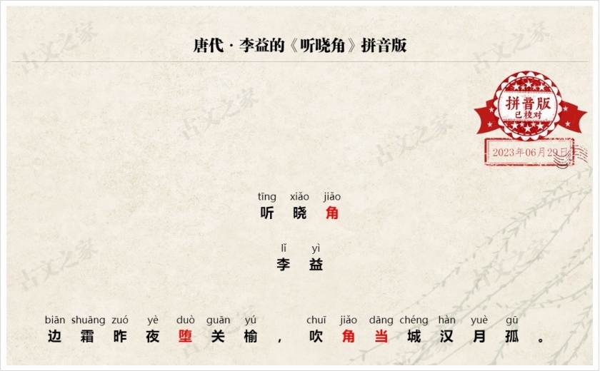 边霜昨夜/堕关榆,吹角当城/汉月孤。无限塞鸿/飞不度,秋风卷入/小单于。