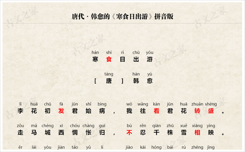 《寒食日出游》拼音版,可打印PDF文档下载韩愈