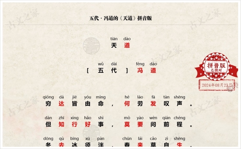 (我们坚持对每一篇古诗文进行人工查证并注音、我们亲自查证并回复来自您的每一次纠错,只为给您一份更为准确的拼音版本,请记住我们:古文之家)