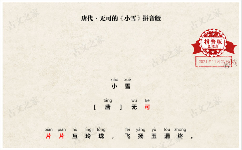 拼音全文:(我们坚持对每一篇古诗文进行人工查证并注音、我们亲自查证并回复来自您的每一次纠错,只为给您一份更为准确的拼音版本,请记住我们:古文之家)