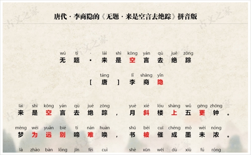 《无题·来是空言去绝踪》拼音版、节奏划分及断句,可打印PDF文档下载李商隐