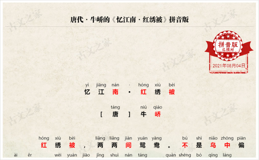 《忆江南·红绣被》拼音版,可打印PDF文档下载牛峤