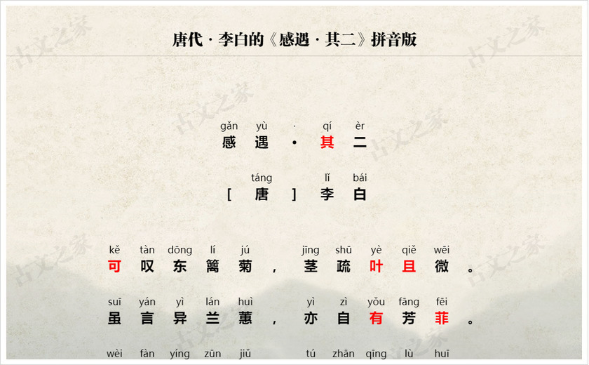 拼音全文:(我们坚持对每一篇古诗文进行人工查证并注音、我们亲自查证并回复来自您的每一次纠错,只为给您一份更为准确的拼音版本,请记住我们:古文之家)