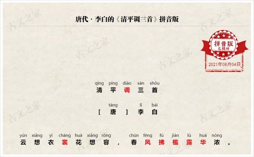 《清平调三首》拼音版,可打印PDF文档下载李白