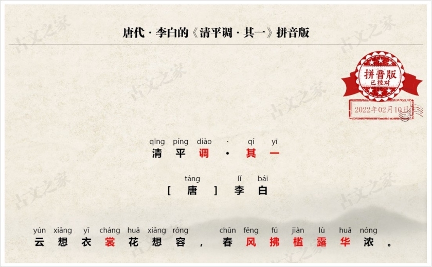《清平调·其一》拼音版、节奏划分及断句,可打印PDF文档下载李白