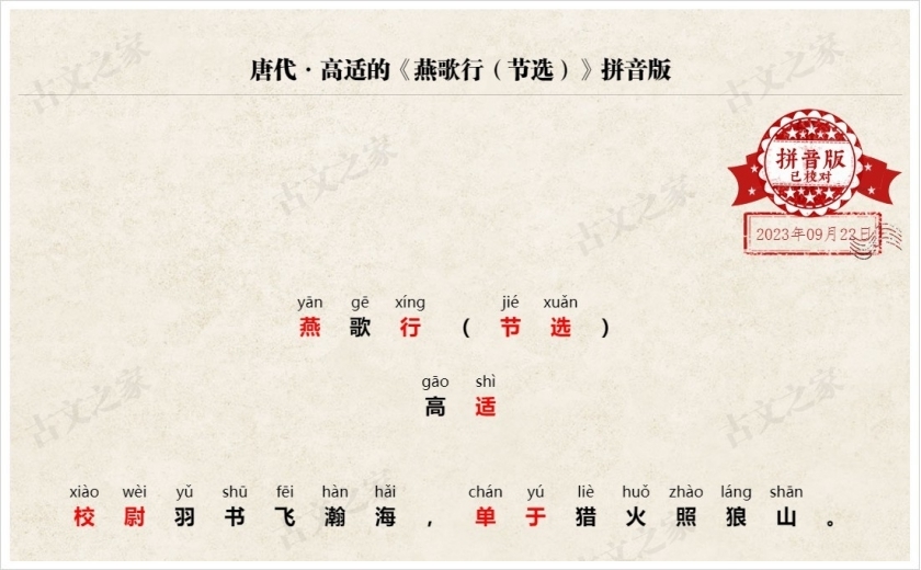 拼音全文:(我们坚持对每一篇古诗文进行人工查证并注音、我们亲自查证并回复来自您的每一次纠错,只为给您一份更为准确的拼音版本,请记住我们:古文之家)