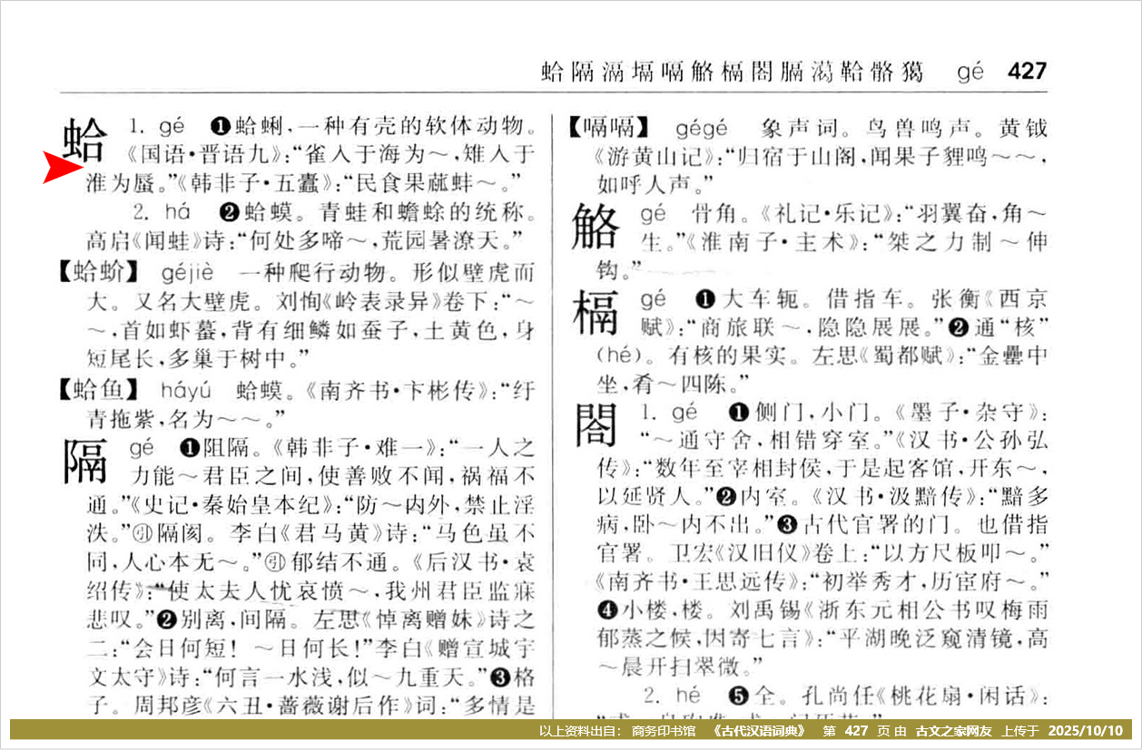 【第1_1楼】可参照商务印书馆的《古代汉语词典》第(427)页 ,内容。非常感谢来自热心读者{[手机用户]:120.235.*.*}的纠错指正,经过我们的人工核对,本文已对相关内容进行了更正。再次感谢您为本文注音所作出的贡献。