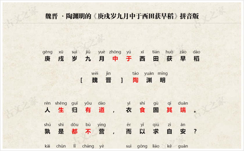 拼音全文:(我们坚持对每一篇古诗文进行人工查证并注音、我们亲自查证并回复来自您的每一次纠错,只为给您一份更为准确的拼音版本,请记住我们:古文之家)