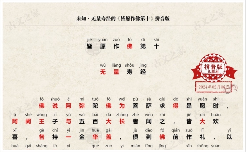 拼音全文:(我们坚持对每一篇古诗文进行人工查证并注音、我们亲自查证并回复来自您的每一次纠错,只为给您一份更为准确的拼音版本,请记住我们:古文之家)