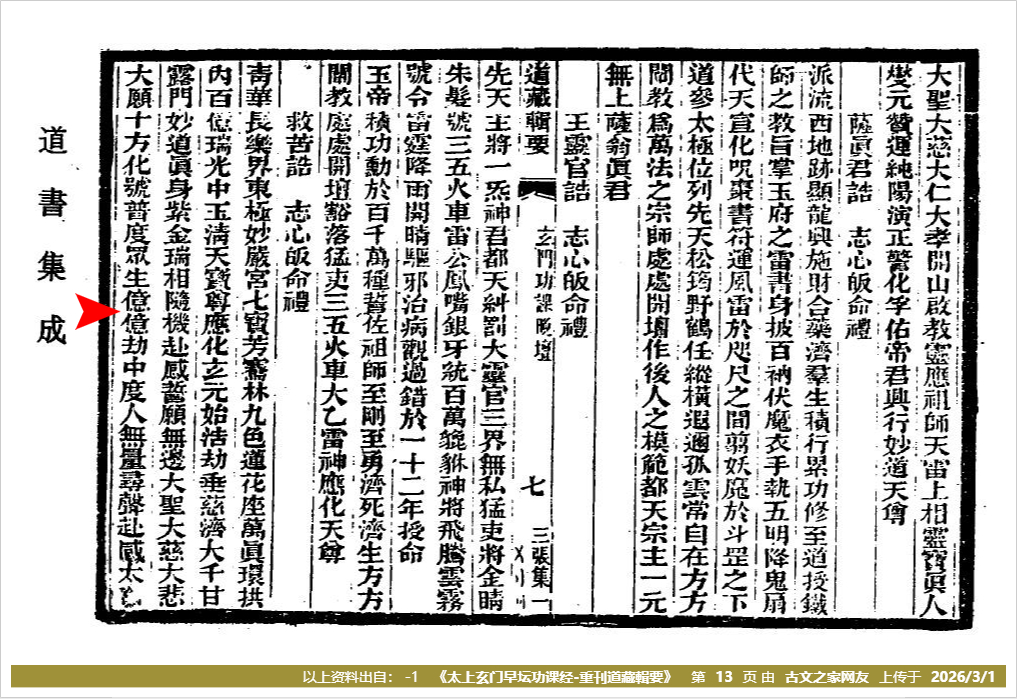 【第1_1楼】可参照的《太上玄门早坛功课经-重刊道藏輯要》第(13)页 ,内容。非常感谢来自热心读者{:14.212.*.*}的纠错指正,经过我们的人工核对,本文已对相关内容进行了更正。再次感谢您为本文注音所作出的贡献。