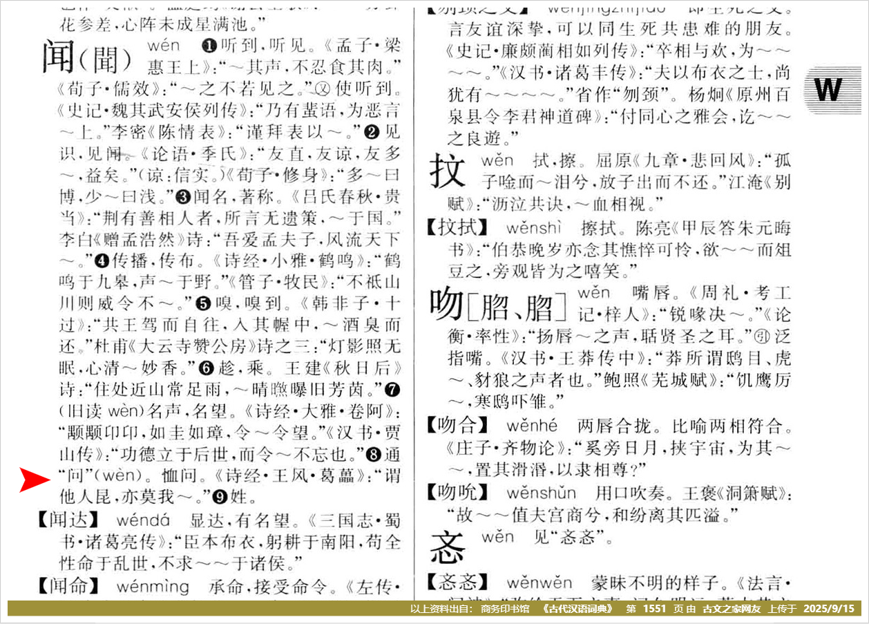 【第4楼】贡献条目闻通“问”wen第四声。慰问。