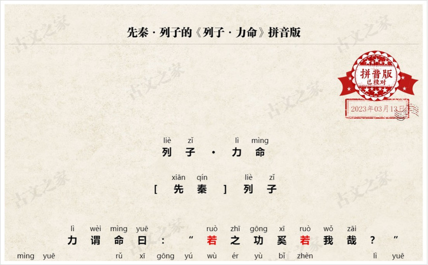 拼音全文:(我们坚持对每一篇古诗文进行人工查证并注音、我们亲自查证并回复来自您的每一次纠错,只为给您一份更为准确的拼音版本,请记住我们:古文之家)